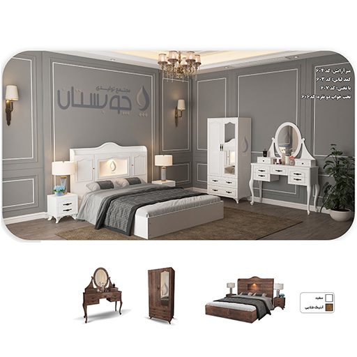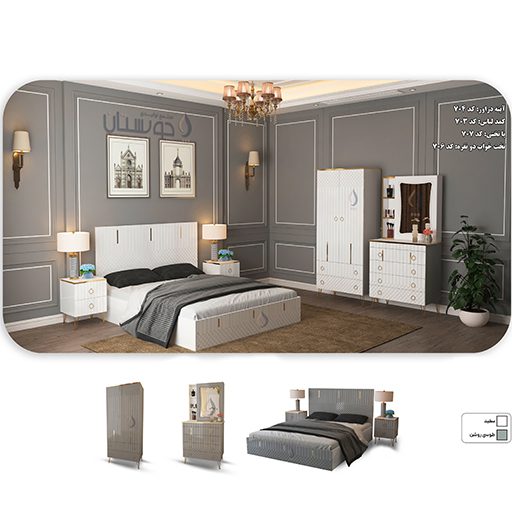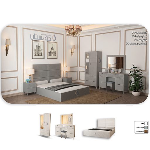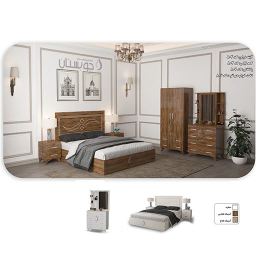 این سرویس شامل تخت خواب دونفره با کفی و 2 عدد پاتختی و کمد لباس و آینه دراور می باشد.